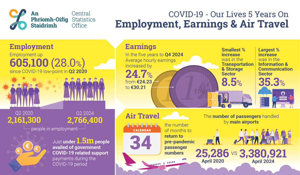 The CSO’s report COVID-19 – Our Lives Five Years On: Impact on Employment, Earnings, and Air Travel, noted that in Q4 2019, before the pandemic hit, Ireland had 2.4 million people in employment, but that number declined to 2.2 million in Q2 2020, at the height of the pandemic.