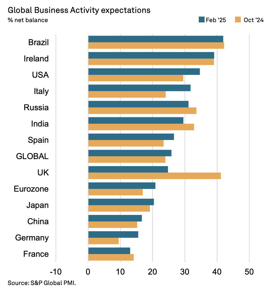 Ireland‘s businesses are particularly bullish about their future prospects, with Irish business expectations the second strongest on a global level, behind only Brazil, the latest S&P Global Business Outlook survey has found.