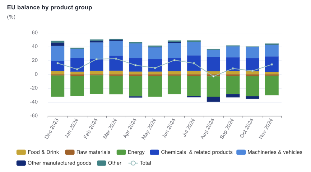 The European Union reported a €14.3 billion trade surplus with the rest of the world in November 2024, compared with a €17.2 billion surplus in the same month the previous year, new data from Eurostat has revealed.