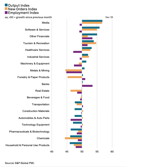 According to the S&P Global Europe Sector PMI, which manages the performance of 19 business sectors across Europe, ten sectors recorded growth in output in December, down slightly from 11 the previous month. The majority of sectors that showed growth were services-based, it noted.