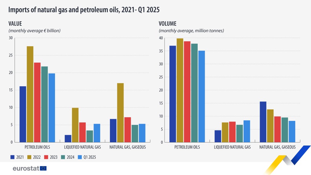 The European Union imported €95.3 billion worth of energy products in the first quarter of 2025, equating to a total volume of 176.4 million tonnes.